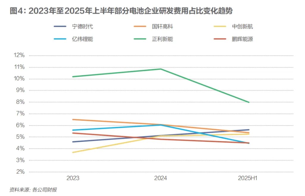 财报数据显示,宁德时代的研发费用几乎是其他几家上市电池企业研发费用之和的3倍,高强度的研发投入带来了多款高技术、高性能的新产品,以及新产品带来的高利润。研发费用占营业收入的比例方面,除了宁德时代和中创新航,其他主要电池企业普遍出现下滑。即便是研发费用率有所增长的中创新航,增速在2025年上半年也明显放缓。当企业将大部分精力用于应对生死存亡的价格战时,对未来的投资必然会变得犹豫和保守。